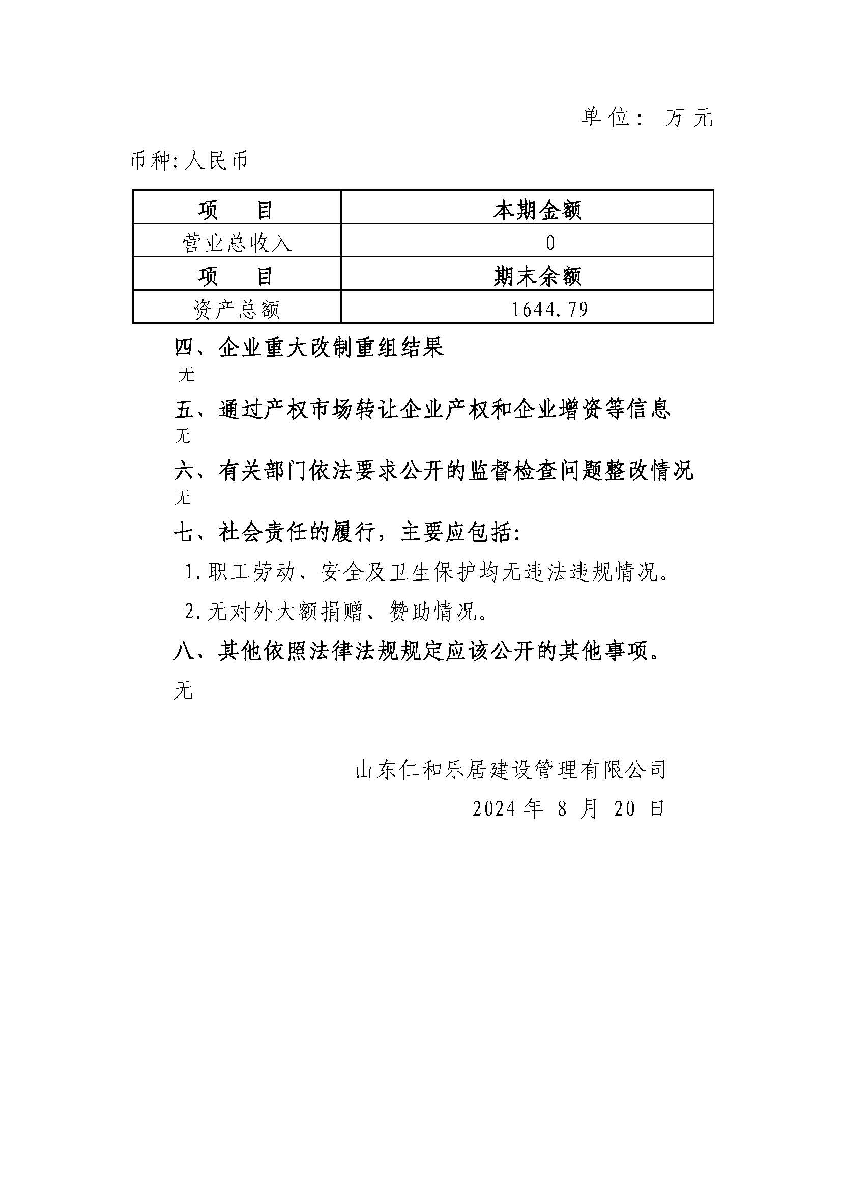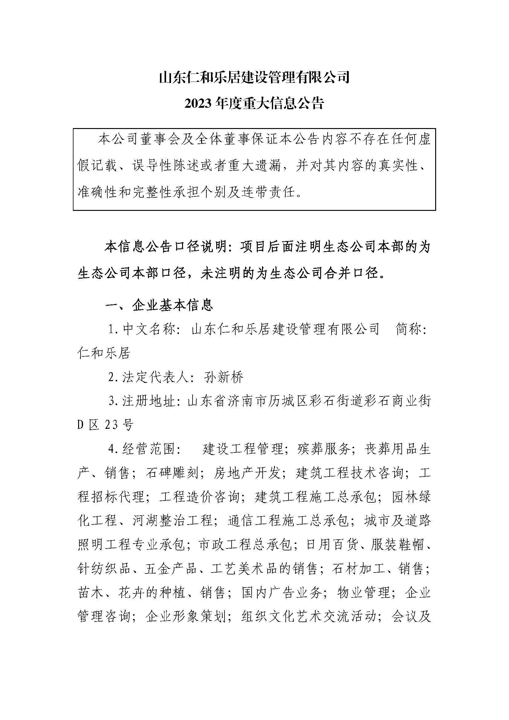 山东仁和乐居建设管理有限公司2023年度重大信息公告