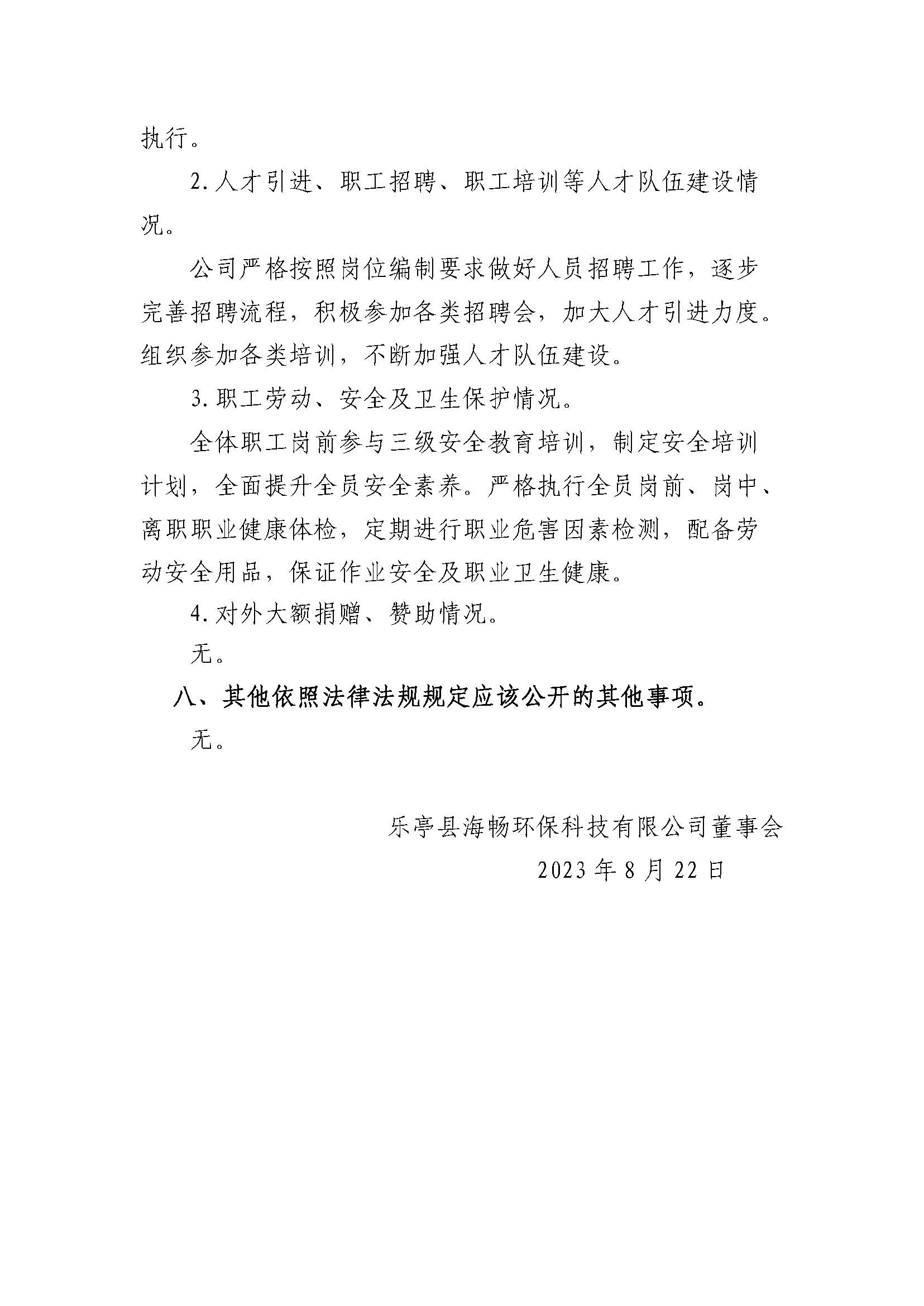 乐亭县海畅环保科技有限公司2023年度重大信息公告