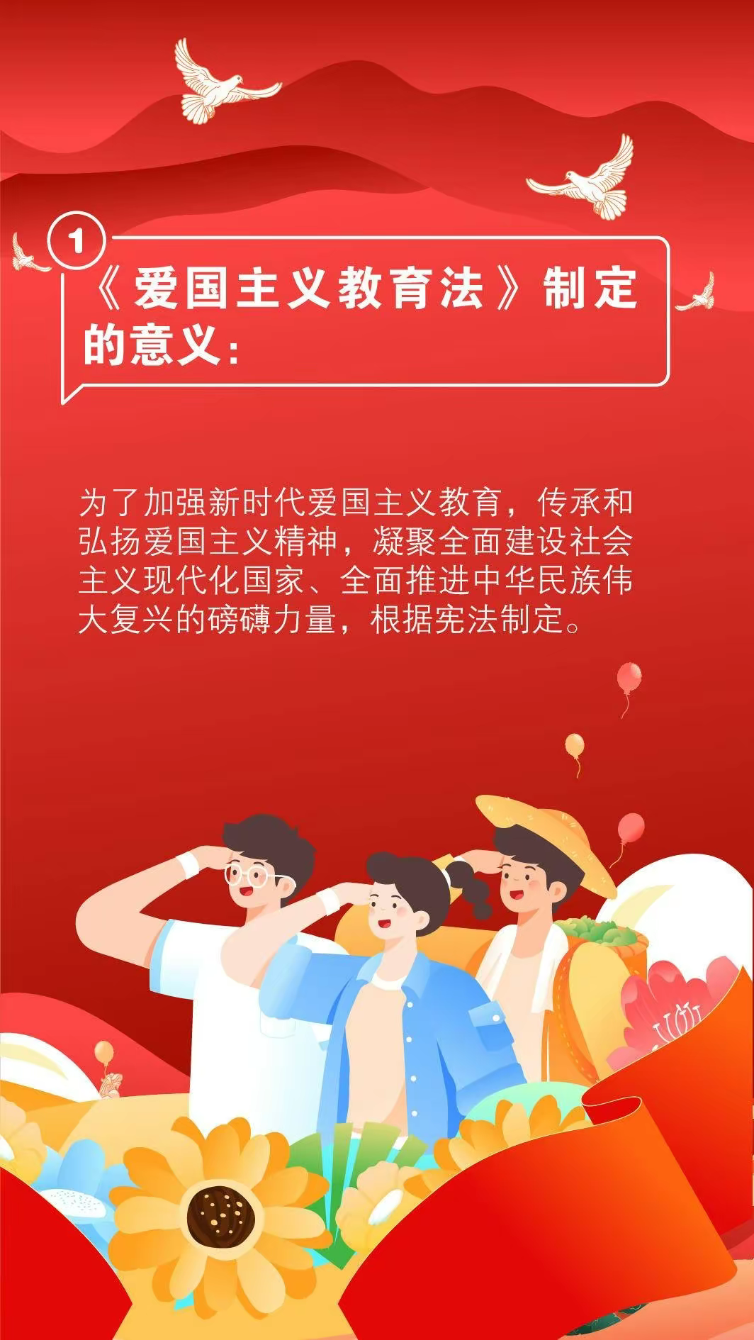 这部旨在加强爱国主义教育、传承和弘扬爱国主义精神的法律, 规定了爱国主义教育的主要内容,以法治方式推动和保障新时代爱国主义教育,对于振奋民族精神、凝聚人民力量,推进强国建设、民族复兴,具有十分重大而深远的意义。