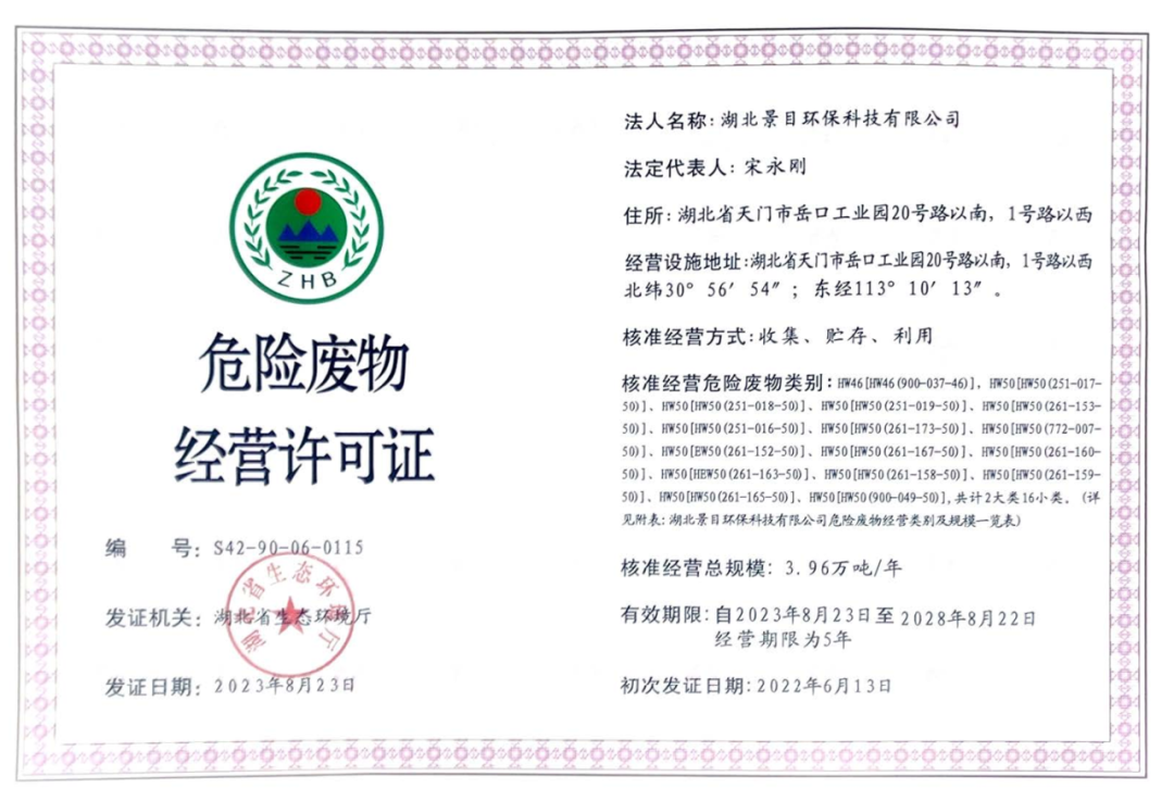近日,湖北景目环保科技有限公司(以下简称“景目环保”)年处理4万吨废催化剂的资源化再生利用项目顺利更换领危废经营许可证(5年期经营证),标志着公司即将投入规模化生产,逐步走上高质量发展道路。