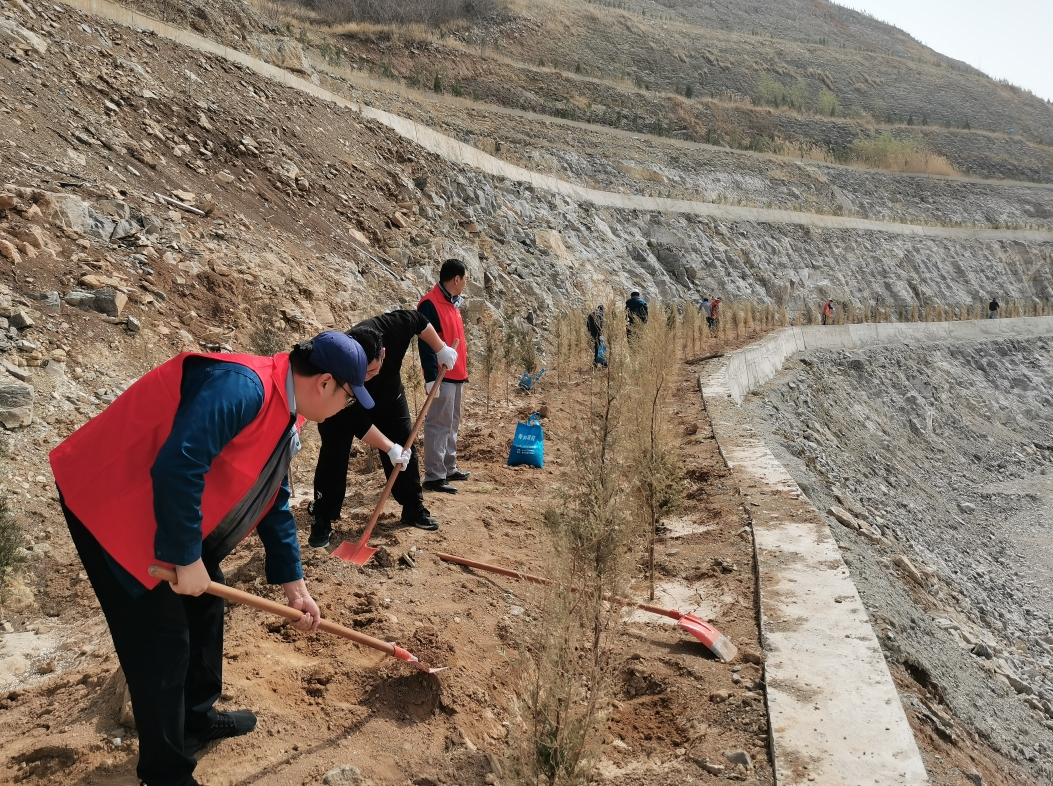 活动中,公司党员和员工将1200棵侧柏树苗历尽千辛万苦的运到100多米高的陡峭山坡上进行栽植,并对原有的绿植进行维护。